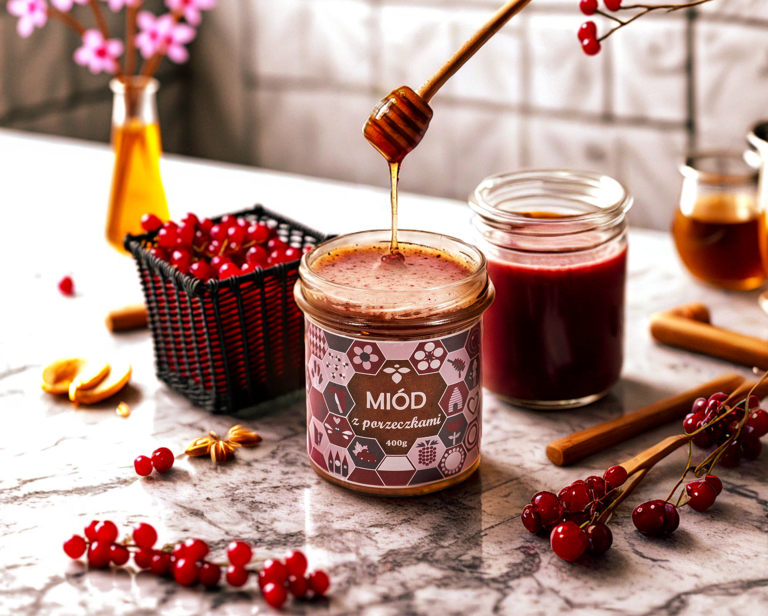 Wyjątkowy miód rzepakowy z dodatkiem liofilizowanej polskiej porzeczki to harmonijne połączenie delikatnej słodyczy i lekkiej kwaskowatości. Miód rzepakowy, znany ze swojej kremowej konsystencji i subtelnego smaku, doskonale komponuje się z intensywnym, owocowym akcentem porzeczki. Liofilizowana porzeczka nie tylko nadaje wyjątkowy smak, ale także zachowuje wszystkie swoje wartości odżywcze i antyoksydacyjne właściwości. Ten naturalny produkt jest doskonałym dodatkiem do deserów, napojów, śniadań czy jako zdrowa przekąska. W 100% naturalny, bez konserwantów, stworzony z polskich surowców najwyższej jakości.
